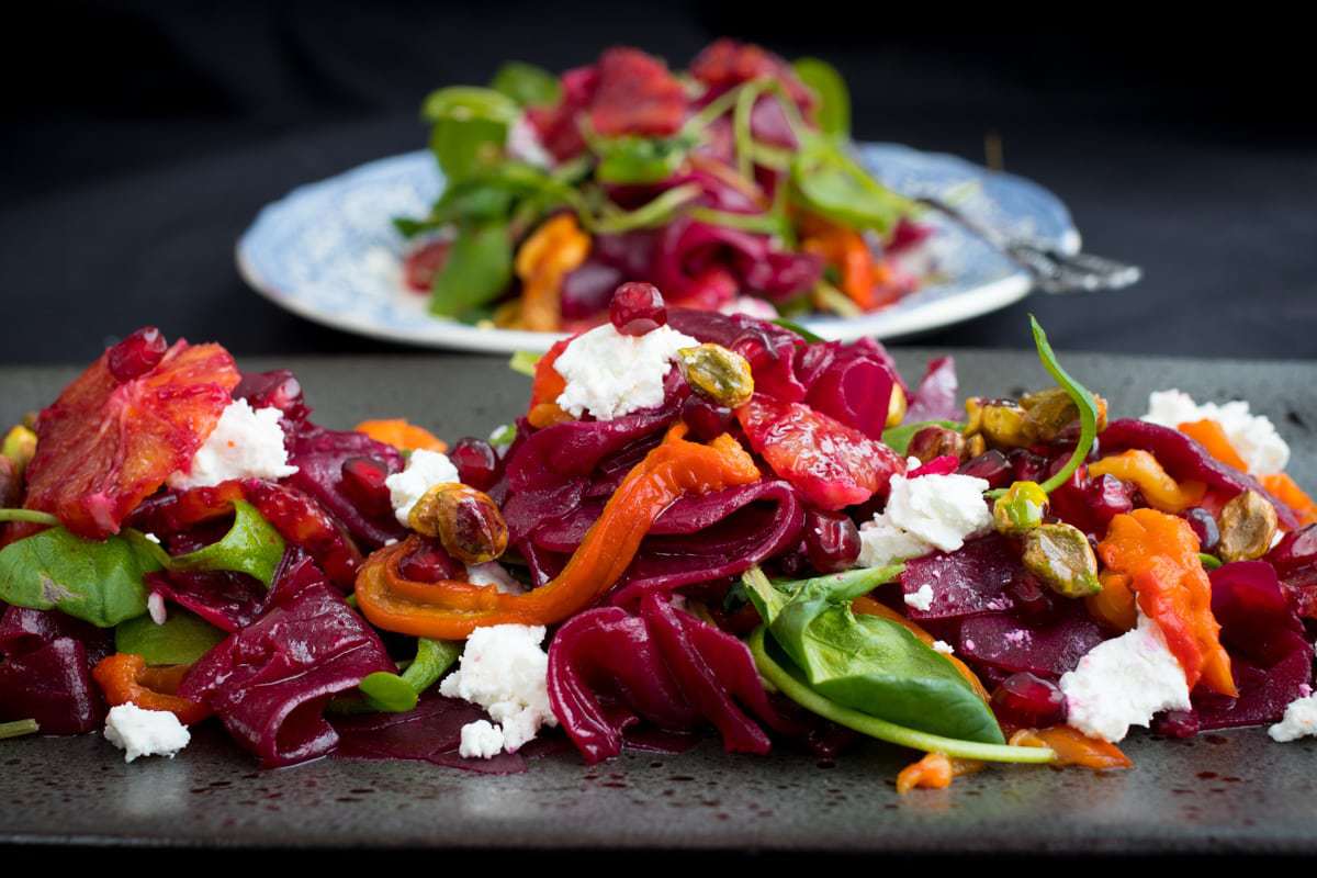 Beetroot and Blood Orange Salad with Roasted Red Pepper, Caramelized Pistachio and Goats Cheese